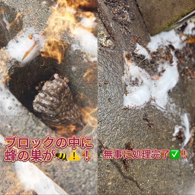 なんと、コンクリブロックの中に蜂の巣が( ゜Д゜)!